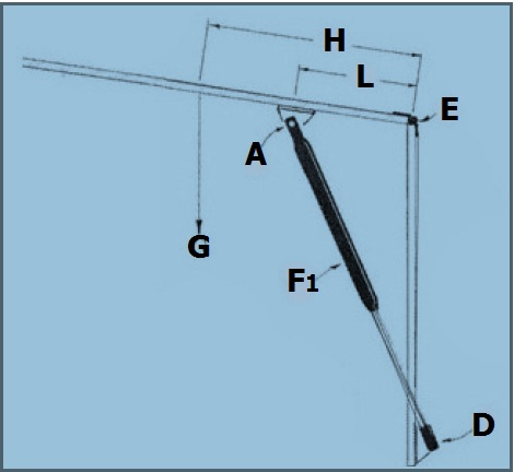 Length of gas stay = H measurement (half the depth of the door from hinge point) + 20% L= mounting distance from hinge (Guide: 405 long = 150mm, 500 long = 200mm, 605 long = 250mm, 700 long = 290mm, H= half the depth of the door from hinge point. G= weight of the door in Newtons (1kg = 10 N) Force = G x H รท L, + 30%, divided by number of stays being used = Newton force.
