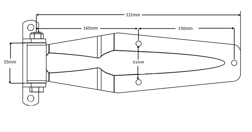 Zinc Coated Mild Steel. Supplied assembled (with bracket and bolt) Suited to 100mm pillar applications. Length = 332mm Seal step = 110mm Width of blade = 88mm Height to pin centre = 40mm Bolt on bracket. Hinge designed for truck or trailer body doors, either rear or side doors, suitable for trailer applications. Universal left or right hinge.