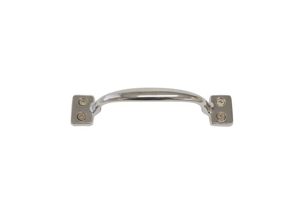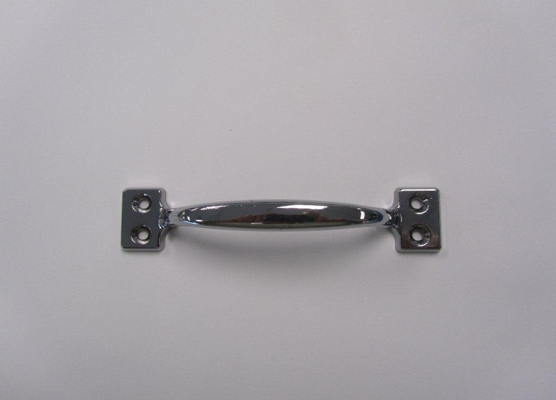 Chrome plated die cast Grab Handle 150mm overall. Hole centres 130mm. Base width 30mm. Height 35mm.