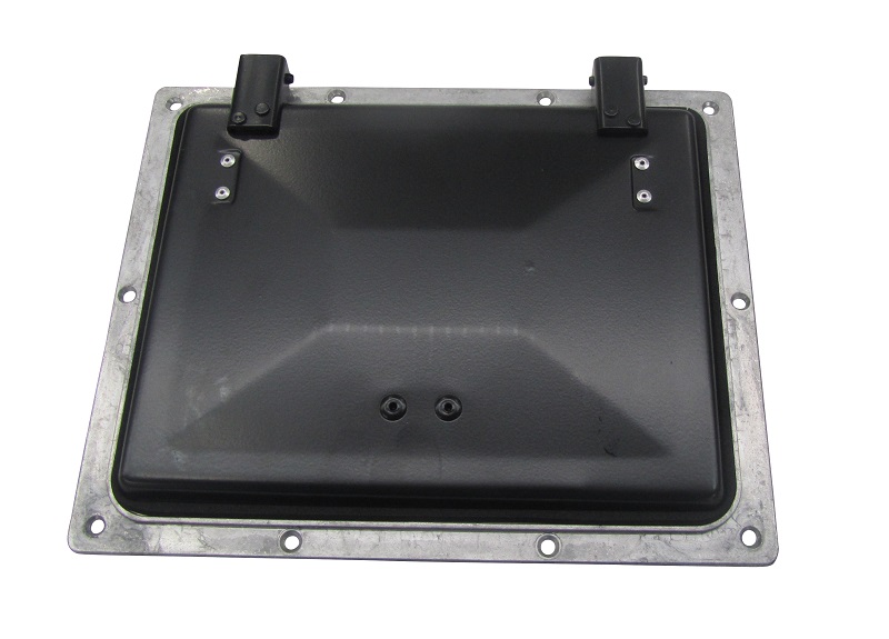 Aluminium frame with seal. Black polycoat pressed steel top. Cut Out Dimensions = 220 mm x 170 mm Overall size = 265mm x 214mm. Opens 25deg. 110mm gap when open.