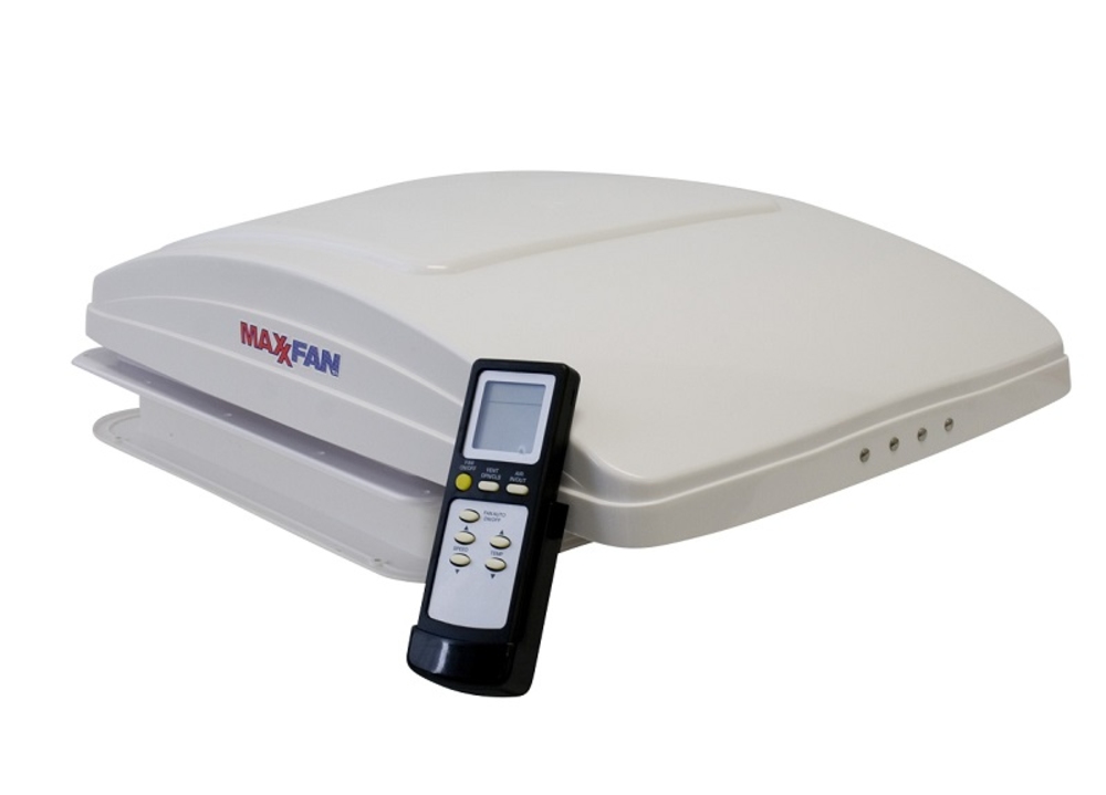 Maxx Fan Deluxe with rain proof shield. 10 speed fan with remote control. 14 x 14 (356mm x 356mm). Amp draw 0.16 on low 2.5a on high, The fan can run even if the lid is closed (select Ceiling Fan Mode) and can be used in intake and exhaust modes, Provides over 900CFM, keeping your RV cool and comfortable. Dimensions closed - 589L x 421W x 128H (mm), Dimensions open 589L x 421W x 230H (mm). 5.4kg. Roof Thickness 25mm (min) 90mm (max), permanent airflow 82cm2