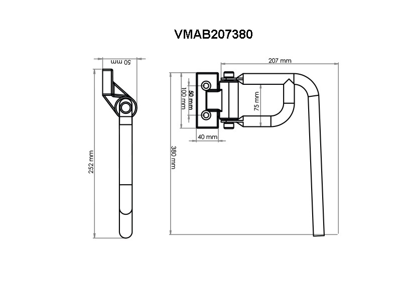 Tube diameter 19mm. Black. 207mm high x 380mm wide. Mounting bracket is 100mm x 40mm with 50mm hole centres. Common in city bus market. Made to ADR standards