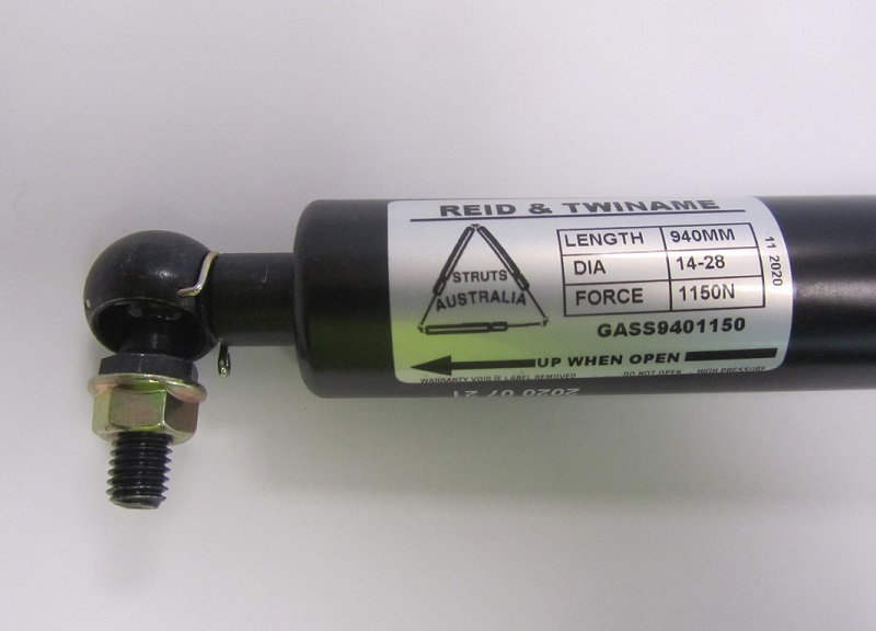 Length of gas stay = H measurement (half the depth of the door from hinge point) + 20% L= mounting distance from hinge (Guide: 405 long = 150mm, 500 long = 200mm, 605 long = 250mm, 700 long = 290mm, H= half the depth of the door from hinge point. G= weight of the door in Newtons (1kg = 10 N) Force = G x H รท L, + 30%, divided by number of stays being used = Newton force. Gas Stay or also known as a Gas Spring, Gas Strut, Length 940mm. Stroke 425mm. Force 1150N. Shaft 14mm 28mm cylinder. Various end fittings available. **Gas stays carry 2yr warranty***