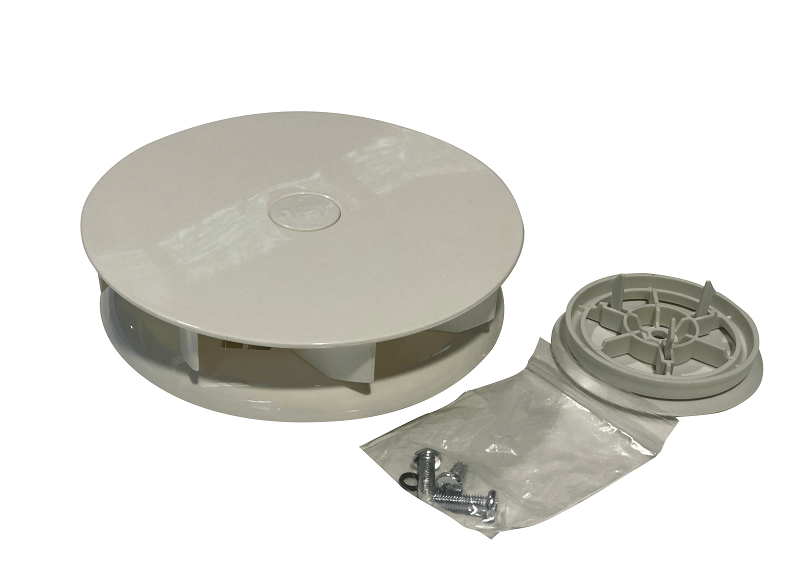 White/Off White CentaFlow Wind Powered Rotary Ventilator, Pre-assembled slimline ventilator equipped with internal adjustment panel & vent plate. Singapore NMB 608Z bearings. Integrated neoprene sealing gasket. 220mm Width x 60 Height & 80mm cut-out. Suits roof thickness 1-17mm. ABS Plastic. 304 Stainless steel spindle and bearings. Extracted volumetric flow rate of 17.2 litres per second at 100kpm.