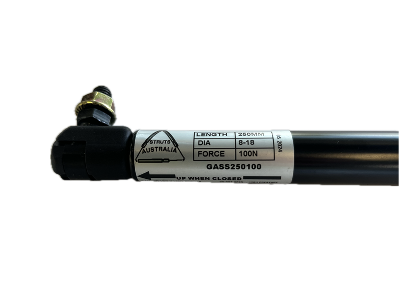 Gas Stay or also known as a Gas Spring, Gas Strut, Length 250mm. Stroke 87mm. Force 100N. Shaft 8mm 18mm cylinder. Various end fittings available. ***Gas stays carry 2yr warranty*** Length of gas stay = H measurement (half the depth of the door from hinge point) + 20% L= mounting distance from hinge (Guide: 405 long = 150mm, 500 long = 200mm, 605 long = 250mm, 700 long = 290mm, H= half the depth of the door from hinge point. G= weight of the door in Newtons (1kg = 10 N) Force = G x H รท L, + 30%, divided by number of stays being used = Newton force.n force.