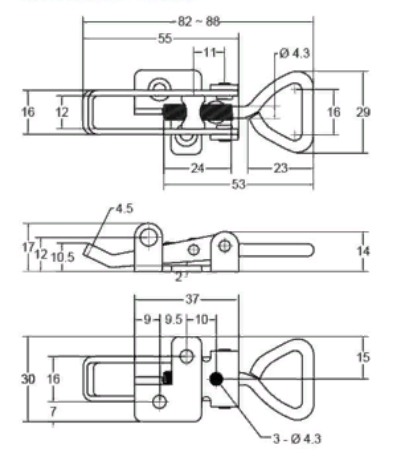 Zinc plated over centre fastener with adjustable triangle hold, pair with catch LT701C. Pad lockable, 30mm wide, main body 55mm long, overall 82mm to 88mm depending on adjustment. countersunk holes.