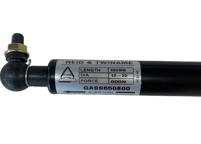 Gas Stay or also known as a Gas Spring, Gas Strut, Length 650mm. Stroke 285mm. Force 800N. Shaft 10mm 22mm cylinder. Various end fittings available. **Gas stays carry 2yr warranty*** Length of gas stay = H measurement (half the depth of the door from hinge point) + 20% L= mounting distance from hinge (Guide: 405 long = 150mm, 500 long = 200mm, 605 long = 250mm, 700 long = 290mm, H= half the depth of the door from hinge point. G= weight of the door in Newtons (1kg = 10 N) Force = G x H รท L, + 30%, divided by number of stays being used = Newton force.