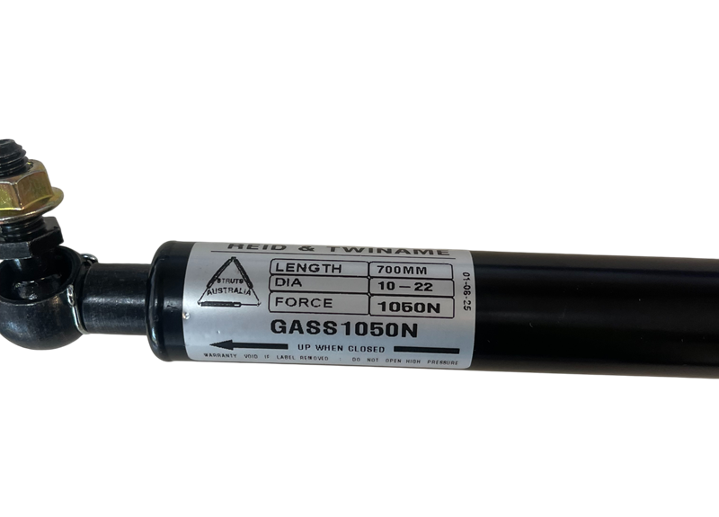 Gas Stay or also known as a Gas Spring, Gas Strut, Length 700mm. Stroke 310mm. Force 1050N. Shaft 10mm 22mm cylinder. Various end fittings available. **Gas stays carry 2yr warranty*** Length of gas stay = H measurement (half the depth of the door from hinge point) + 20% L= mounting distance from hinge (Guide: 405 long = 150mm, 500 long = 200mm, 605 long = 250mm, 700 long = 290mm, H= half the depth of the door from hinge point. G= weight of the door in Newtons (1kg = 10 N) Force = G x H รท L, + 30%, divided by number of stays being used = Newton force.