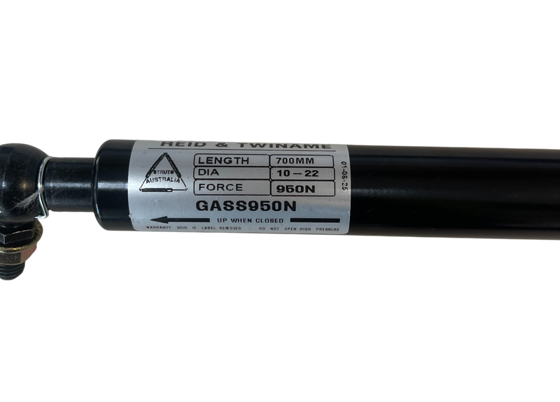 Gas Stay or also known as a Gas Spring, Gas Strut, Length 700mm. Stroke 310mm. Force 950N. Shaft 10mm 22mm cylinder. Various end fittings available. **Gas stays carry 2yr warranty*** Length of gas stay = H measurement (half the depth of the door from hinge point) + 20% L= mounting distance from hinge (Guide: 405 long = 150mm, 500 long = 200mm, 605 long = 250mm, 700 long = 290mm, H= half the depth of the door from hinge point. G= weight of the door in Newtons (1kg = 10 N) Force = G x H รท L, + 30%, divided by number of stays being used = Newton force.