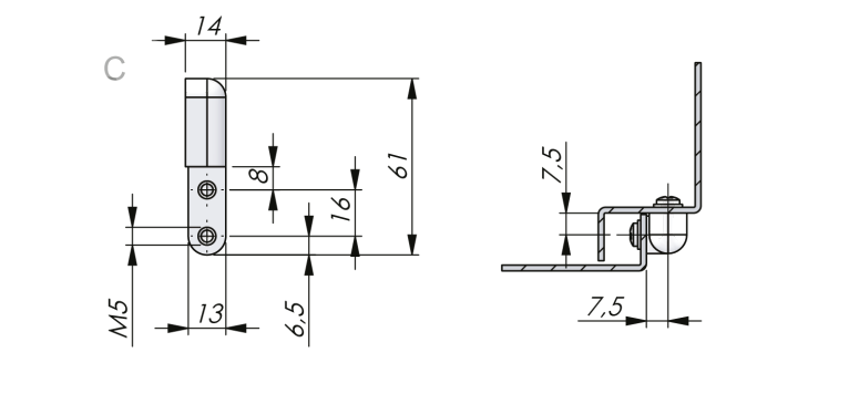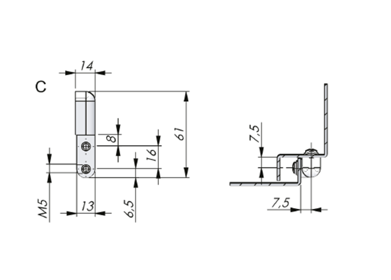 Industrilas Hinge, Zinc die cast chrome plated, 61mm Long x 14mm High x 13mm Wide, 4 x threaded M5 holes. Universal left and right. CAD File