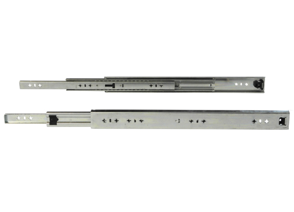 Quality pair of NON-LOCKING125kg 508mm closed length zinc plated steel drawerslides. 100% extension. 500mm closed 1000mm extended. 125kg slides are 57mm high, 18.7mm thickness. 125kg 500mm drawer slides maximum load of 125kgs when open. Weight range 125kg and 227kg. In locking and non locking versions. Duraslide. When marking hole placements you MUST NOT drill through the slide holes during installation. Doing this will create metal filings which lodge in the tracks resulting in rough running and ultimately, failure of the slides.Depending on substrate, stainless steel 'flat head' hex screws with NY-lock nuts or stainless steel rivets are recommended. There must be no rubbing of the fixing against the moving slides. This will cause failure of the slide.