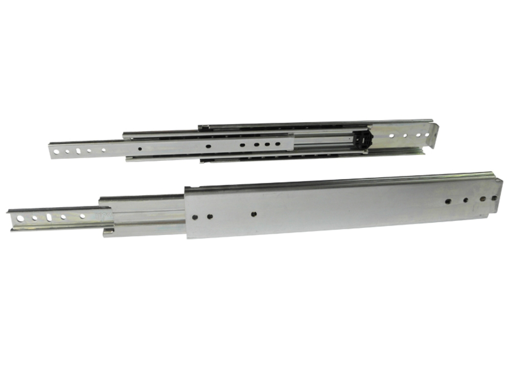 Quality pair of NON-LOCKING 227kg 812mm closed length zinc plated steel drawerslides. 100% extension. 800mm closed 1600mm extended. 227kg maximum weight extended 220kgs. Slides are 76mm high, 19.3mm thick Weight range 125kg and 227kg. In locking and non locking versions. Duraslide. When marking hole placements you MUST NOT drill through the slide holes during installation. Doing this will create metal filings which lodge in the tracks resulting in rough running and ultimately, failure of the slides.Depending on substrate, stainless steel 'flat head' hex screws with NY-lock nuts or stainless steel rivets are recommended. There must be no rubbing of the fixing against the moving slides. This will cause failure of the slide.